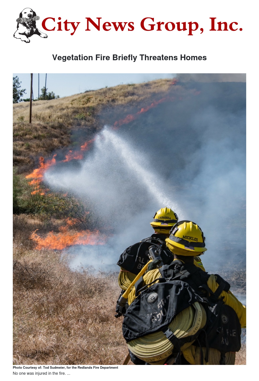 Redlands Firefighters responded to a fast moving vegetation fire that blackened nine acres and briefly threatened homes on the east side of Redlands Monday afternoon. No injuries were reported.