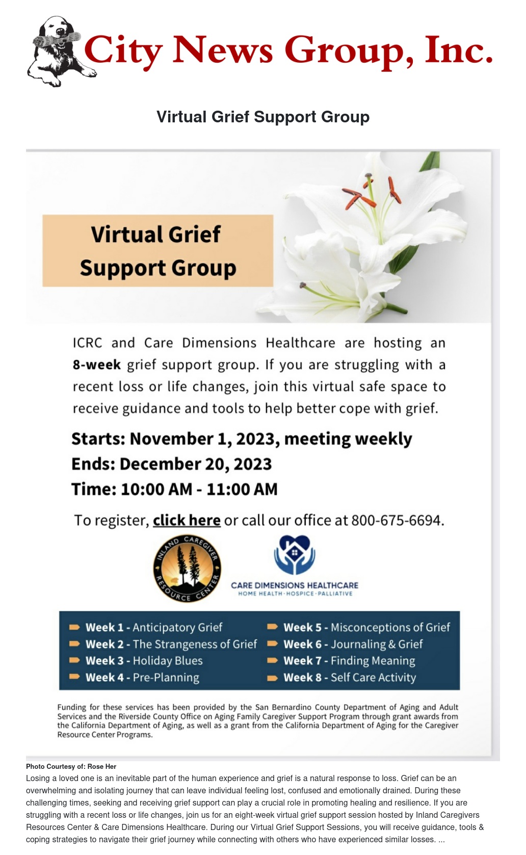 Losing a loved one is an inevitable part of the human experience and grief is a natural response to loss. Grief can be an overwhelming and isolating journey that can leave individual feeling lost, confused and emotionally drained. During these challenging times, seeking and receiving grief support can play a crucial role in promoting healing and resilience. If you are struggling with a recent loss or life changes, join us for an eight-week virtual grief support session hosted by Inland Caregivers Resource Center & Care Dimensions Healthcare. During our Virtual Grief Support Sessions, you will receive guidance, tools & coping strategies to navigate their grief journey while connecting with others who have experienced similar losses.