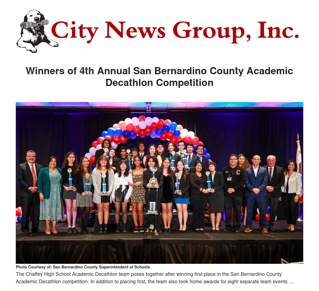 The back-to-back champion team, Chaffey High School of Chaffey Joint Union High School District, will send its top nine scoring decathletes and coach to represent San Bernardino County at the California Academic Decathlon State Competition in Santa Clara from March 25-26. At large teams may also represent the county at the state competition.