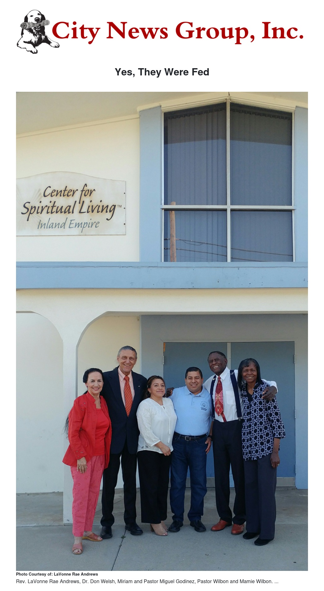 It all began with an idea, inspired by Spirit. Pastor A.L Wilbon has a friend who is able to get food to supply those in need. He mentioned this opportunity to the new Ministers, Rev. LaVonne Rae Andrews and her husband, Dr. Don Welsh, at the “Center for Spiritual Living” on Golden Avenue in San Bernardino. Their Sunday service begins at 10:00 a.m.